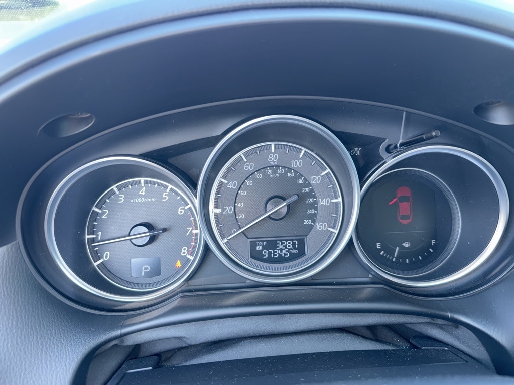 This Mazda CX-5 is well equipped with Grand Touring Technology Package, 19 x 7J Aluminum Alloy Wheels, 4-Wheel Disc Brakes, 4.62 Axle Ratio, 9 Speakers, ABS brakes, Air Conditioning, Alloy wheels, AM/FM radio, Automatic temperature control, Bose 9-Speaker Audio Sound System, Brake assist, Bumpers: body-color, CD player, Delay-off headlights, Driver door bin, Driver vanity mirror, Dual front impact airbags, Dual front side impact airbags, Electronic Stability Control, Exterior Parking Camera Rear, Four wheel independent suspension, Front anti-roll bar, Front Bucket Seats, Front Center Armrest, Front dual zone A/C, Front fog lights, Front reading lights, Fully automatic headlights, Heated door mirrors, Heated front seats, Heated Front Sport Shape Seats, Illuminated entry, Leather Seat Trim, Leather Shift Knob, Low tire pressure warning, Occupant sensing airbag, Outside temperature display, Overhead airbag, Overhead console, Panic alarm, Passenger door bin, Passenger vanity mirror, Power door mirrors, Power driver seat, Power moonroof, Power steering, Power windows, Radio data system, Radio: AM/FM/CD/HD Modular Audio System w/Bose, Rain sensing wipers, Rear anti-roll bar, Rear reading lights, Rear seat center armrest, Rear window defroster, Rear window wiper, Remote keyless entry, Speed control, Speed-sensing steering, Split folding rear seat, Spoiler, Steering wheel mounted audio controls, Tachometer, Telescoping steering wheel, Tilt steering wheel, Traction control, Trip computer, Turn signal indicator mirrors, and Variably intermittent wipers.