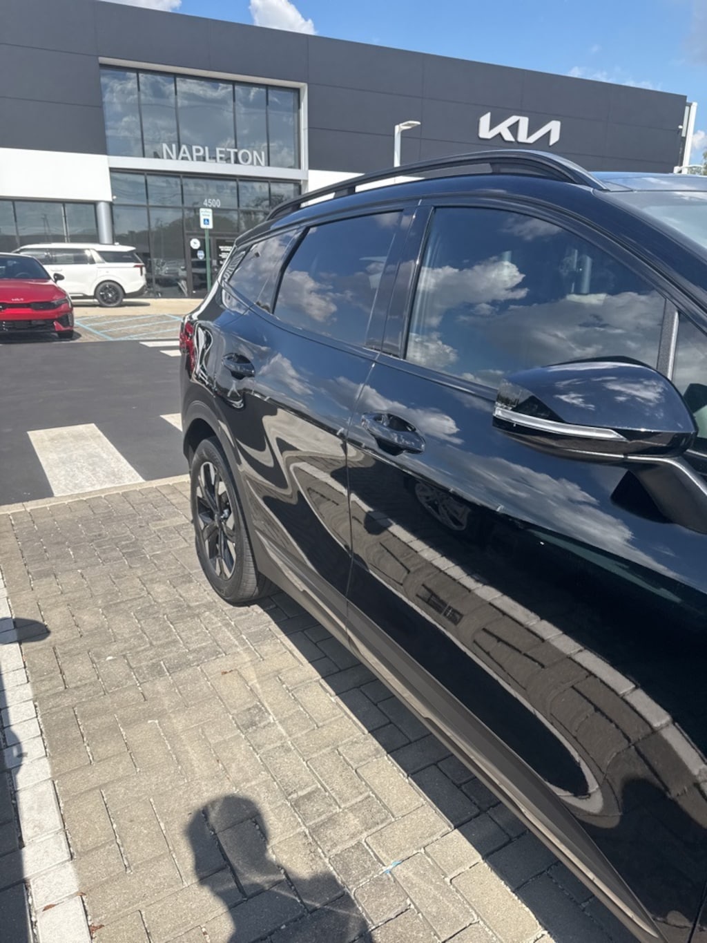 This Sportage is well equipped with Sage Green Interior Color Package, X-Line Premium Package (LED Interior Lighting, Panoramic Sunroof, and Smart Power Liftgate), AWD, 4-Wheel Disc Brakes, 6 Speakers, ABS brakes, Air Conditioning, Alloy wheels, AM/FM radio: SiriusXM, Apple CarPlay & Android Auto, Auto High-beam Headlights, Automatic temperature control, Axle Ratio: 3.648, Brake assist, Bumpers: body-color, Carpet Floor Mats X-Line, Compass, Delay-off headlights, Driver door bin, Driver vanity mirror, Dual front impact airbags, Dual front side impact airbags, Electronic Stability Control, Emergency communication system, Four wheel independent suspension, Front anti-roll bar, Front Bucket Seats, Front Center Armrest, Front dual zone A/C, Fully automatic headlights, Heated door mirrors, Heated Front Bucket Seats, Heated front seats, Illuminated entry, Leather steering wheel, Low tire pressure warning, Navigation System, Occupant sensing airbag, Outside temperature display, Overhead airbag, Overhead console, Panic alarm, Passenger door bin, Passenger vanity mirror, Power door mirrors, Power driver seat, Power steering, Power windows, Premium Leatherette Seat Trim, Radio: AM/FM/HD Audio System, Rain sensing wipers, Rear anti-roll bar, Rear seat center armrest, Rear side impact airbag, Rear window defroster, Rear window wiper, Remote keyless entry, Security system, Speed control, Speed-sensing steering, Split folding rear seat, Spoiler, Steering wheel mounted audio controls, Tachometer, Telescoping steering wheel, Tilt steering wheel, Traction control, Trip computer, Turn signal indicator mirrors, Variably intermittent wipers, and Wheels: 19" Gloss Black Alloy.
