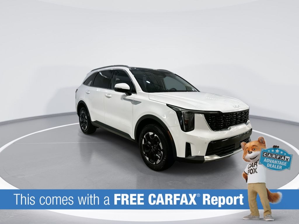 This Sorento is well equipped with Panoramic Sunroof Package (LED Interior Lighting and Panoramic Power Sunroof w/Power Sunshade), AWD, 3rd row seats: split-bench, 4-Wheel Disc Brakes, 6 Speakers, ABS brakes, Air Conditioning, Alloy wheels, AM/FM radio: SiriusXM, Apple CarPlay & Android Auto, Auto High-beam Headlights, Automatic temperature control, Brake assist, Bumpers: body-color, Carpeted Floor Mats, Delay-off headlights, Driver door bin, Driver vanity mirror, Dual front impact airbags, Dual front side impact airbags, Electronic Stability Control, Emergency communication system: 911 Connect, Exterior Parking Camera Rear, Four wheel independent suspension, Front anti-roll bar, Front Bucket Seats, Front Center Armrest, Front dual zone A/C, Front reading lights, Fully automatic headlights, Heated door mirrors, Heated Front Bucket Seats, Heated front seats, Illuminated entry, Knee airbag, Leather Shift Knob, Leather steering wheel, Low tire pressure warning, Navigation System, Occupant sensing airbag, Outside temperature display, Overhead airbag, Overhead console, Panic alarm, Passenger door bin, Passenger vanity mirror, Power door mirrors, Power driver seat, Power steering, Power windows, Radio data system, Radio: AM/FM Standard Sound System, Rear anti-roll bar, Rear reading lights, Rear seat center armrest, Rear side impact airbag, Rear window defroster, Rear window wiper, Remote keyless entry, Security system, Speed control, Speed-sensing steering, Split folding rear seat, Spoiler, Steering wheel mounted audio controls, SynTex Artificial Leather Seat Trim, Tachometer, Telescoping steering wheel, Tilt steering wheel, Traction control, Trip computer, Turn signal indicator mirrors, Variably intermittent wipers, and Wheels: 18" Gloss Black Alloy.